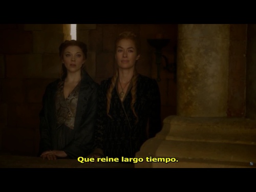 Observando al nuevo Rey ocupando su trono por primera vez, recibiendo los respetos y alabanzas de todo el mundo, Cersei conversa con Margaery, admitiendo la crueldad de su difunto hijo, y de algún extraño modo (como todo lo que esta mujer hace contra su voluntad) le pide y a la vez le da su consentimiento a la joven para que se case con Tommen cuando el luto por Joffrey sea sólo un recuerdo.