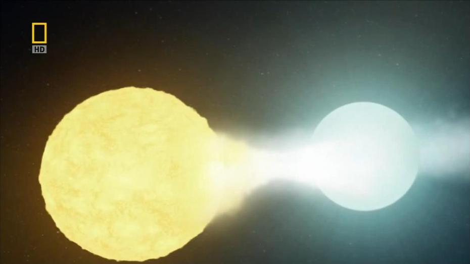 Representación de dos estrellas absorbiéndose (Algol) a 100 años luz de la Tierra en el documental "Viaje a los límites del Universo"