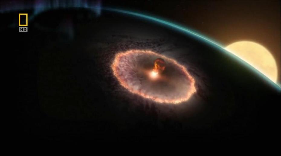Representación del impacto de un meteorito contra un planeta en el documental "Viaje a los límites del Universo"