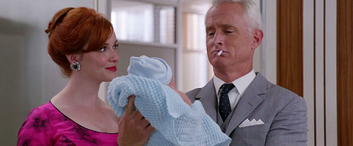 Joan puede ser la mejor secretaria de Sterling-Cooper-Draper-Pryce, pero ser madre le supera. Su marido sigue en la guerra de Vietnam, por lo que ella se encuentra sola, y ninguna madre nace aprendida. Afortunadamente, para afrontar esta complicada situación cuenta con el respaldo de su anticuada madre Gail (Christine Estabrook). Joan tiene claro que no quiere ser la típica madre ama de casa (en parte porque no lo soportaría), sino que quiere mantener su trabajo, por ello decide hacer una visita a la oficina junto a Kevin, su retoño, allí descubre que siguen contando con ella. Me parece gracioso que durante este momento en el que Joan deja a su hijo, nadie quiera hacerse cargo del niño y que como si de un ente extraño se tratara, vaya pasando continuamente de manos en manos.